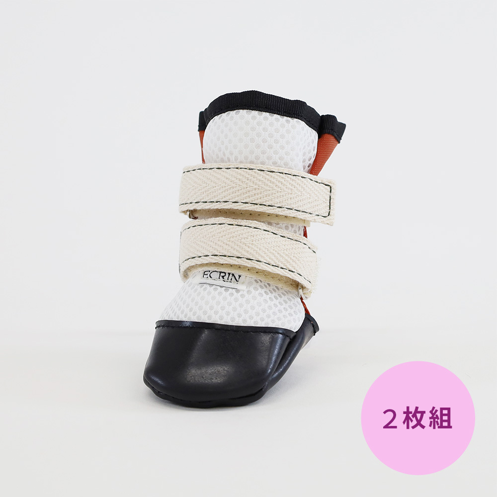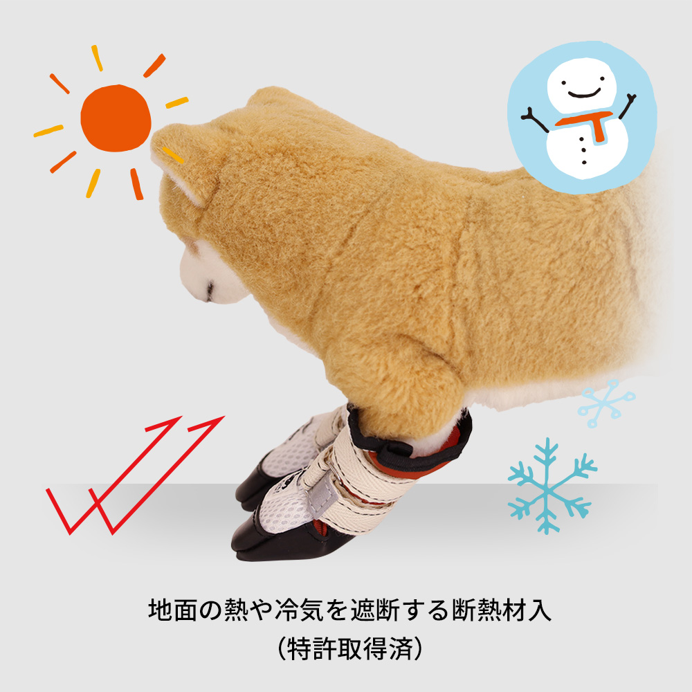 脱げにくいフィット感と、反射素材による視認性の確保も魅力です。広い履き口は靴の出し入れが簡単で、飼い主さまの装着負担を軽くします。
