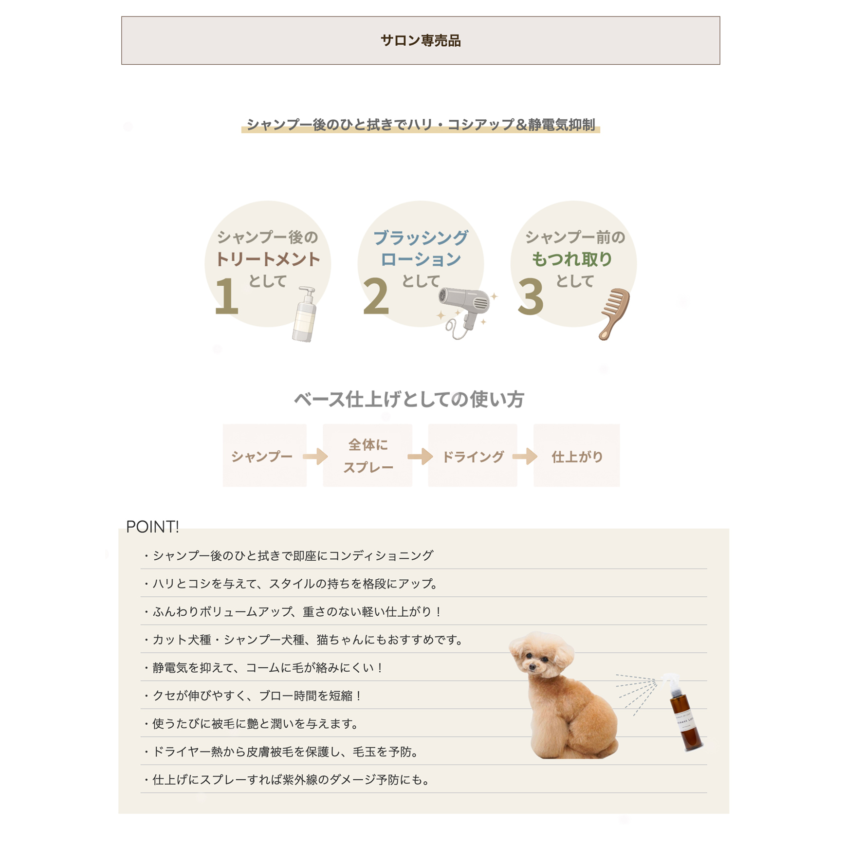 被毛をコンディショニングしながら、ハリコシを与え、どこまでもふわふわでボリュームのあるカットスタイルを叶えてくれます。